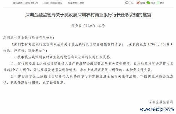 证券配资的条件 深圳农商银行行长莫汝展任职资格获批