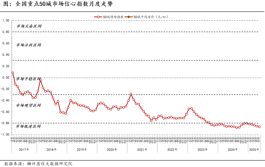 报告显示,5月重点50城市场信心指数为-0.86,环比微跌0.01,同比下降0.01,继续位于市场低迷区间。